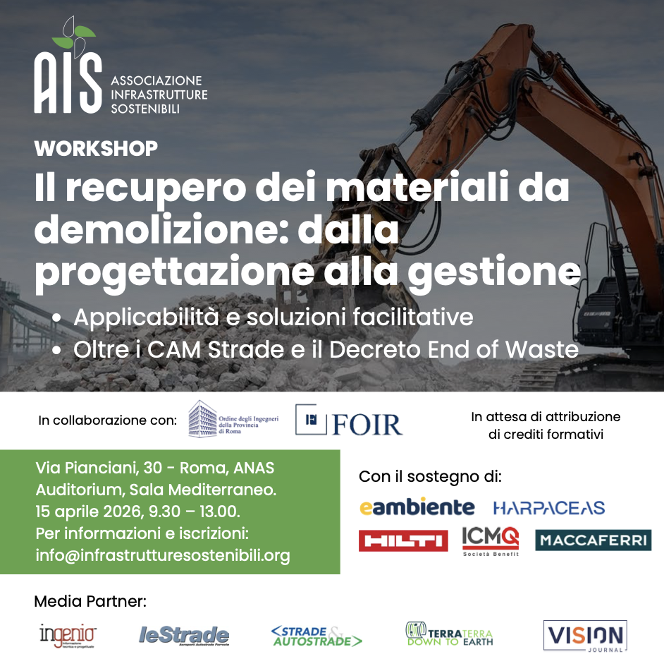 AIS Associazione Italiana Infrastrutture Sostenibili avvia il nuovo gruppo di lavoro “Recupero di materiali da demolizione”. Per presentarne contenuti e finalità organizza a Roma il workshop “Recupero dei materiali da demolizione: dalla progettazione alla gestione. Applicabilità e soluzioni facilitative”. La rivista leStrade è tra i media partner.
