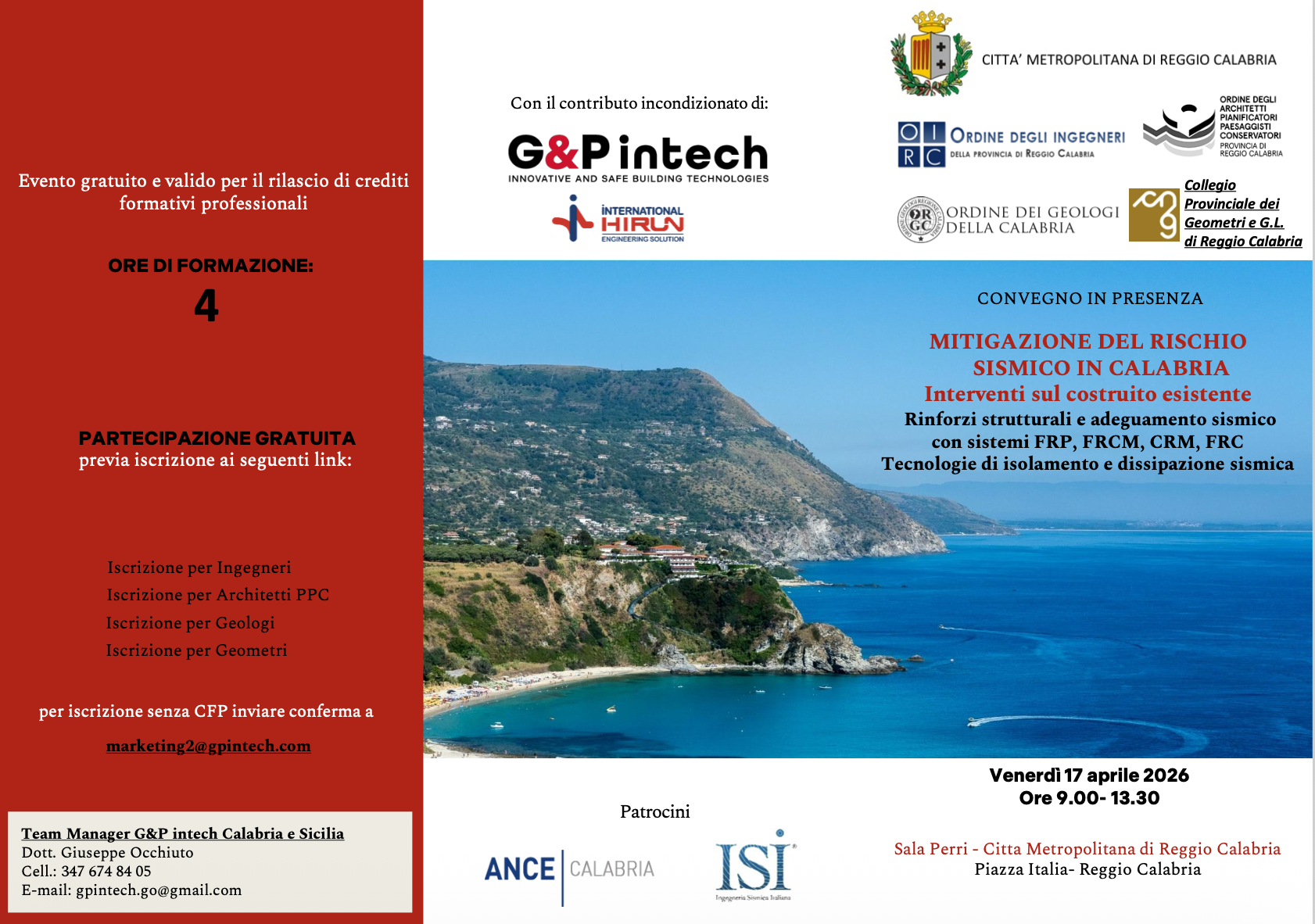 Il convegno e promosso dall'Ordine degli Ingegneri, dall'Ordine degli Architetti PPC, dall'Ordine Regionale dei Geologi e dal Collegio Provinciale dei Geometri della provincia di Reggio Calabria, con il patrocinio della Citta Metropolitana di Reggio Calabria, di ANCE Calabria e dell'Associazione di Ingegneria Sismica Italiana (ISI). La partecipazione e gratuita previa iscrizione.