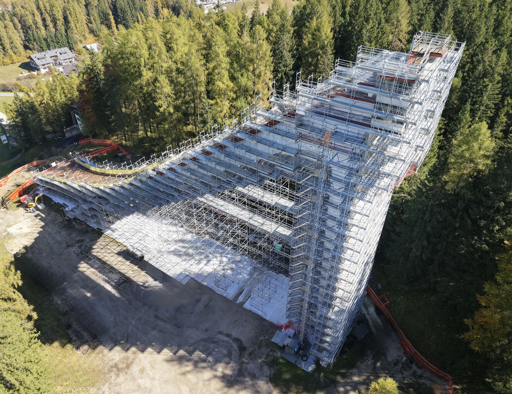 Un’altra difficoltà, poi superata, è stata quella nell’adattamento del ponteggio alla complessa e irregolare geometria inclinata del trampolino, mantenendo al contempo un’elevata stabilità strutturale. Queste caratteristiche si sono rese necessarie per sostenere i carichi operativi e le attrezzature in un ambiente che, seppur bellissimo e con un panorama mozzafiato, è esposto a forti venti dovuti alla morfologia del territorio e alle sue altitudini.