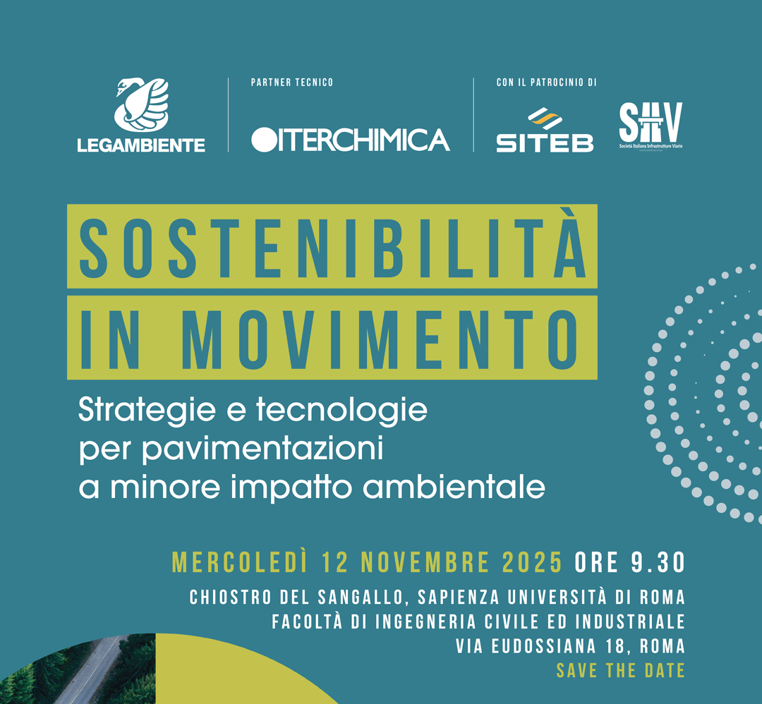 A Roma, al Chiostro del Sangallo, Facoltà di Ingegneria civile e industriale – Sapienza Università di Roma, mercoledì 12 novembre 2025 si terrà il convegno Sostenibilità in Movimento promosso da Legambiente. Iterchimica sarà partner tecnico dell’evento che si svolgerà con il patrocinio di SIIV, SITEB e della Sapienza Università di Roma.