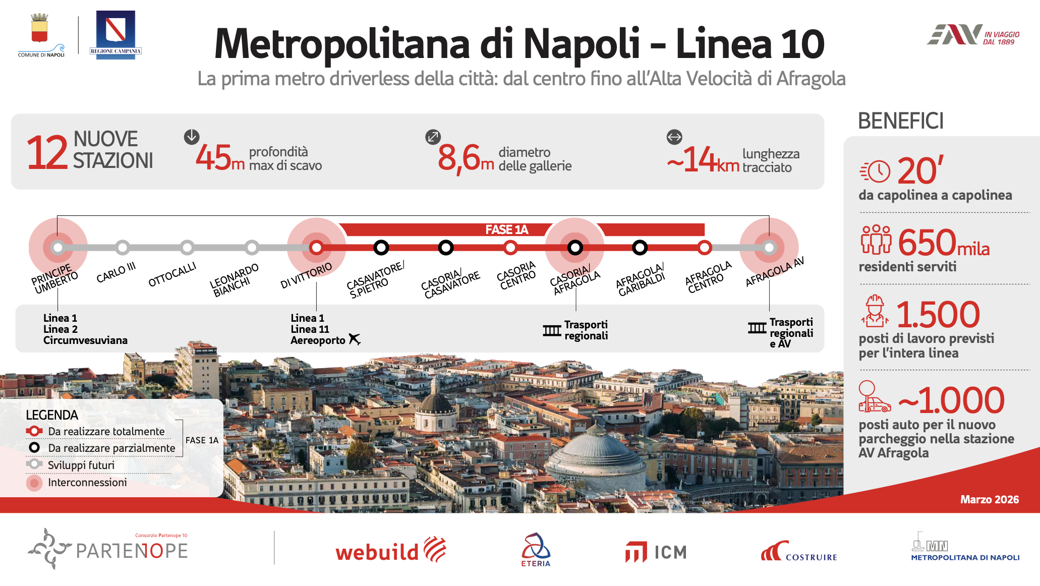 I lavori per la realizzazione della Linea 10 saranno eseguiti per fasi. Il contratto siglato oggi prevede la realizzazione della Fase 1A del Lotto 1 e include anche il diritto in esclusiva per il consorzio a realizzare ulteriori opere, in attesa di finanziamento, per il futuro completamento della linea verso il centro di Napoli e la stazione AV Napoli-Afragola, portando il valore complessivo del Lotto 1 a oltre €1,7 miliardi. Il consorzio che eseguirà i lavori è composto, oltre che da Webuild, da Eteria Consorzio Stabile, Costruire, ICM e M.N. Metropolitana di Napoli.